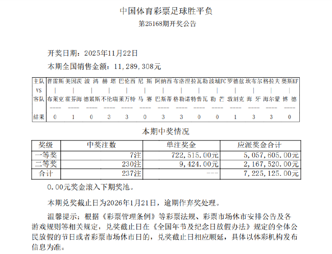 本期兑奖截止日为2026年1月21日,14场2等开出230注,德乙波鸿1-2负于德累斯顿、荷乙坎布尔2-0击败海牙;其余场次,单注奖金722,515元。